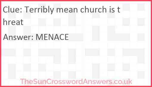 Terribly mean church is threat is a crossword clue for which we have 1 possible answer and we have spotted 2 times in our database. This crossword clue was last seen on 01 November 2024 in The Sun Cryptic Crossword puzzle!