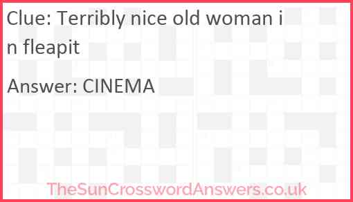 Terribly nice old woman in fleapit is a crossword clue for which we have 1 possible answer and we have spotted 2 times in our database. This crossword clue was last seen on 28 October 2024 in The Sun Cryptic Crossword puzzle!