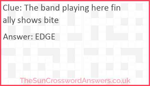 The band playing here finally shows bite is a crossword clue for which we have 1 possible answer and we have spotted 1 times in our database. This crossword clue was last seen on 14 January 2025 in The Sun Cryptic Crossword puzzle!
