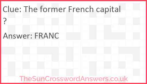 The former French capital? is a crossword clue for which we have 1 possible answer and we have spotted 3 times in our database. This crossword clue was last seen on 20 October 2023 in The Sun Cryptic Crossword puzzle!
