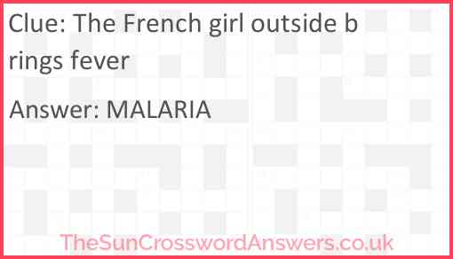 The French girl outside brings fever is a crossword clue for which we have 1 possible answer and we have spotted 3 times in our database. This crossword clue was last seen on 08 October 2023 in The Sun Cryptic Crossword puzzle!