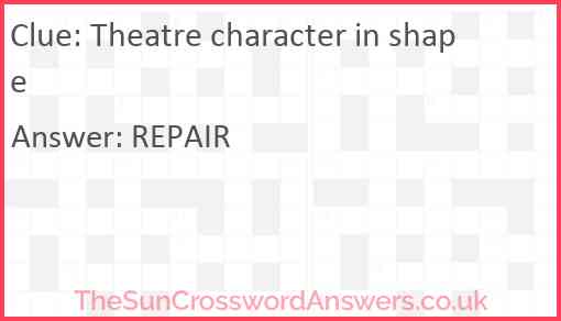Theatre character in shape is a crossword clue for which we have 1 possible answer and we have spotted 3 times in our database. This crossword clue was last seen on 31 July 2023 in The Sun Cryptic Crossword puzzle!