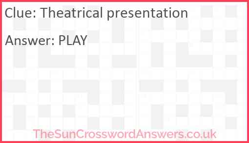 Theatrical presentation is a crossword clue for which we have 1 possible answer and we have spotted 3 times in our database. This crossword clue was last seen on 05 March 2023 in The Sun Coffee Time Crossword puzzle!