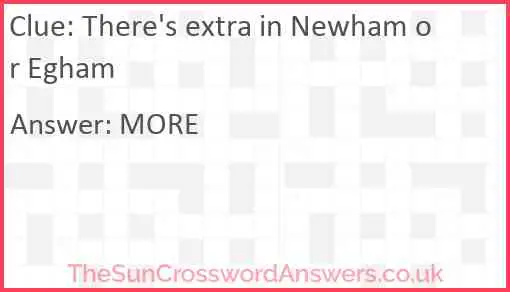 There's extra in Newham or Egham is a crossword clue for which we have 1 possible answer and we have spotted 2 times in our database. This crossword clue was last seen on 12 January 2024 in The Sun Cryptic Crossword puzzle!