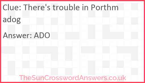 There's trouble in Porthmadog is a crossword clue for which we have 1 possible answer and we have spotted 3 times in our database. This crossword clue was last seen on 27 July 2025 in The Sun Cryptic Crossword puzzle!