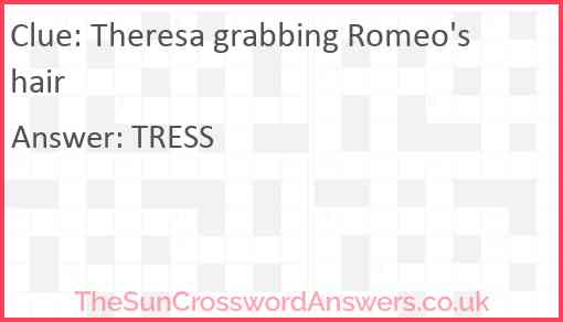Theresa grabbing Romeo's hair is a crossword clue for which we have 1 possible answer and we have spotted 1 times in our database. This crossword clue was last seen on 26 July 2021 in The Sun Cryptic Crossword puzzle!