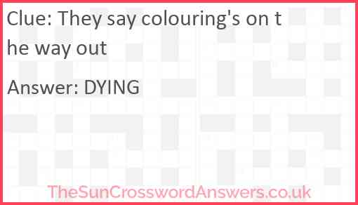 They say colouring's on the way out is a crossword clue for which we have 1 possible answer and we have spotted 1 times in our database. This crossword clue was last seen on 24 October 2024 in The Sun Cryptic Crossword puzzle!