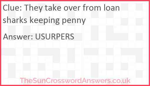They take over from loan sharks keeping penny is a crossword clue for which we have 1 possible answer and we have spotted 1 times in our database. This crossword clue was last seen on 19 September 2023 in The Sun Cryptic Crossword puzzle!
