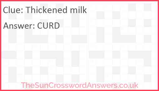 Thickened milk is a crossword clue for which we have 1 possible answer and we have spotted 1 times in our database. This crossword clue was last seen on 16 March 2019 in The Sun Coffee Time Crossword puzzle!