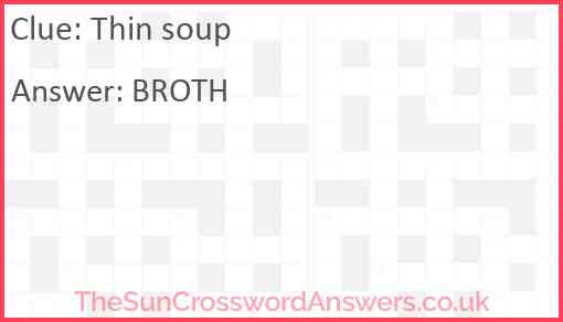 Thin soup is a crossword clue for which we have 2 possible answer and we have spotted 6 times in our database. This crossword clue was last seen on 12 November 2022 in The Sun Coffee Time Crossword puzzle!