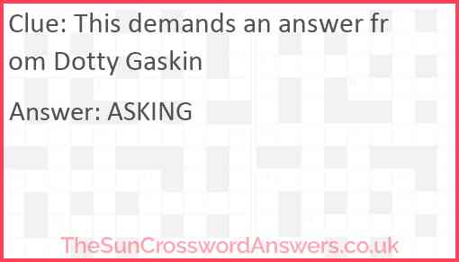 This demands an answer from Dotty Gaskin is a crossword clue for which we have 1 possible answer and we have spotted 2 times in our database. This crossword clue was last seen on 07 October 2022 in The Sun Cryptic Crossword puzzle!