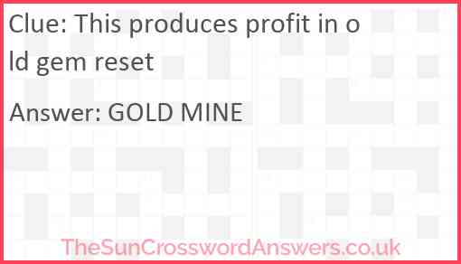 This produces profit in old gem reset is a crossword clue for which we have 2 possible answer and we have spotted 2 times in our database. This crossword clue was last seen on 28 May 2022 in The Sun Cryptic Crossword puzzle!