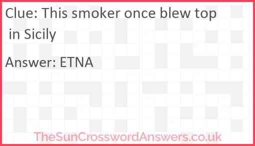 This smoker once blew top in Sicily is a crossword clue for which we have 1 possible answer and we have spotted 1 times in our database. This crossword clue was last seen on 17 May 2024 in The Sun Cryptic Crossword puzzle!