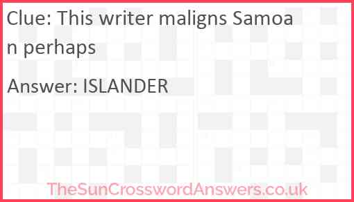 This writer maligns Samoan perhaps is a crossword clue for which we have 1 possible answer and we have spotted 1 times in our database. This crossword clue was last seen on 08 December 2024 in The Sun Cryptic Crossword puzzle!