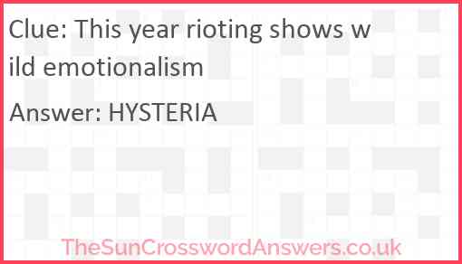 This year rioting shows wild emotionalism is a crossword clue for which we have 1 possible answer and we have spotted 1 times in our database. This crossword clue was last seen on 26 January 2025 in The Sun Cryptic Crossword puzzle!