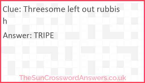 Threesome left out rubbish is a crossword clue for which we have 1 possible answer and we have spotted 5 times in our database. This crossword clue was last seen on 09 September 2023 in The Sun Cryptic Crossword puzzle!