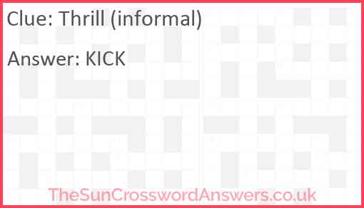 Thrill (informal) is a crossword clue for which we have 1 possible answer and we have spotted 1 times in our database. This crossword clue was last seen on 16 July 2019 in The Sun Coffee Time Crossword puzzle!