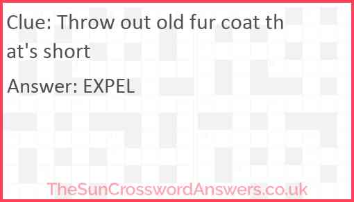Throw out old fur coat that's short is a crossword clue for which we have 1 possible answer and we have spotted 2 times in our database. This crossword clue was last seen on 01 May 2025 in The Sun Cryptic Crossword puzzle!
