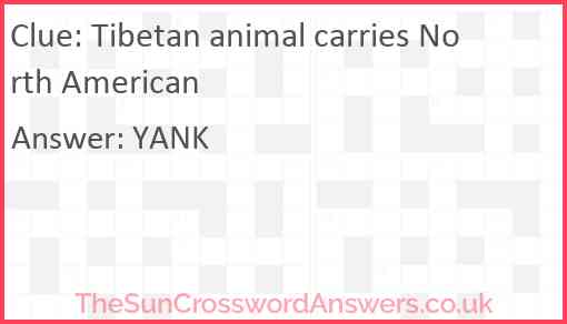 Tibetan animal carries North American is a crossword clue for which we have 1 possible answer and we have spotted 2 times in our database. This crossword clue was last seen on 11 December 2021 in The Sun Cryptic Crossword puzzle!