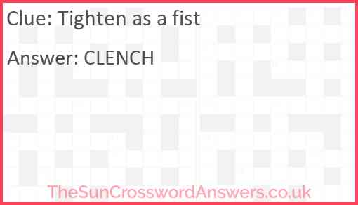 Tighten as a fist is a crossword clue for which we have 1 possible answer and we have spotted 1 times in our database. This crossword clue was last seen on 14 December 2018 in The Sun Coffee Time Crossword puzzle!