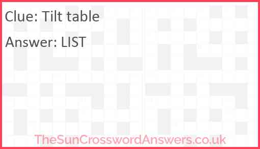 Tilt table is a crossword clue for which we have 1 possible answer and we have spotted 1 times in our database. This crossword clue was last seen on 09 August 2024 in The Sun Cryptic Crossword puzzle!