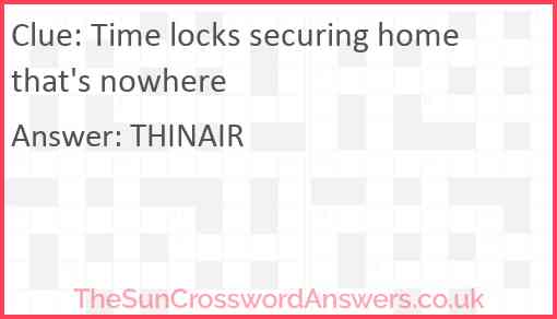 Time locks securing home that's nowhere is a crossword clue for which we have 1 possible answer and we have spotted 1 times in our database. This crossword clue was last seen on 08 August 2020 in The Sun Cryptic Crossword puzzle!