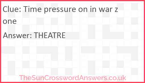 Time pressure on in war zone is a crossword clue for which we have 1 possible answer and we have spotted 1 times in our database. This crossword clue was last seen on 27 January 2025 in The Sun Cryptic Crossword puzzle!