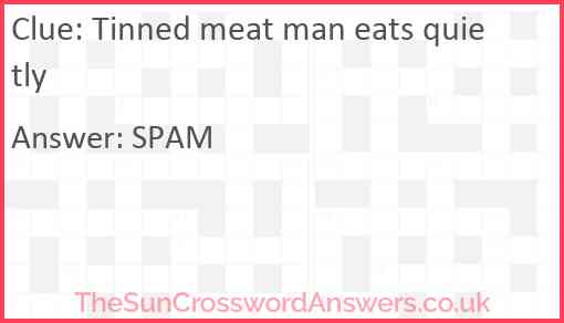 Tinned meat man eats quietly is a crossword clue for which we have 1 possible answer and we have spotted 2 times in our database. This crossword clue was last seen on 20 February 2024 in The Sun Cryptic Crossword puzzle!