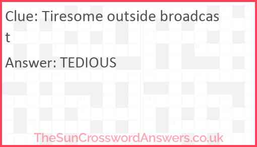 Tiresome outside broadcast is a crossword clue for which we have 1 possible answer and we have spotted 2 times in our database. This crossword clue was last seen on 19 October 2024 in The Sun Cryptic Crossword puzzle!