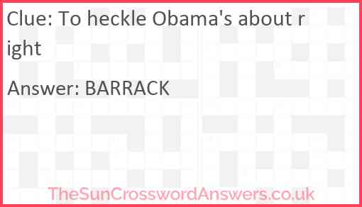 To heckle Obama's about right is a crossword clue for which we have 1 possible answer and we have spotted 1 times in our database. This crossword clue was last seen on 18 July 2023 in The Sun Cryptic Crossword puzzle!
