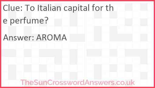 To Italian capital for the perfume? is a crossword clue for which we have 1 possible answer and we have spotted 1 times in our database. This crossword clue was last seen on 03 August 2024 in The Sun Cryptic Crossword puzzle!