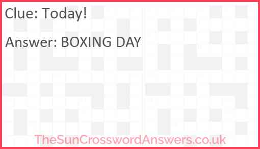 Today! is a crossword clue for which we have 1 possible answer and we have spotted 1 times in our database. This crossword clue was last seen on 26 December 2019 in The Sun Coffee Time Crossword puzzle!