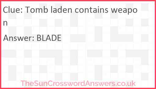 Tomb laden contains weapon is a crossword clue for which we have 1 possible answer and we have spotted 2 times in our database. This crossword clue was last seen on 10 February 2022 in The Sun Cryptic Crossword puzzle!