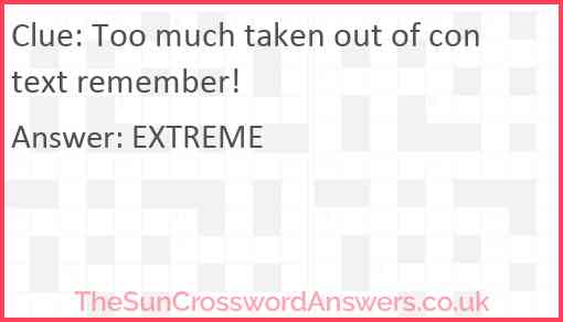 Too much taken out of context remember! is a crossword clue for which we have 1 possible answer and we have spotted 1 times in our database. This crossword clue was last seen on 23 September 2021 in The Sun Cryptic Crossword puzzle!