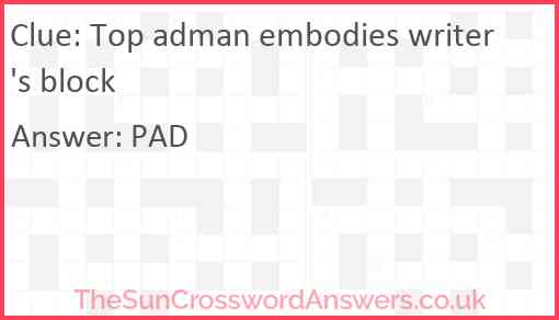 Top adman embodies writer's block is a crossword clue for which we have 1 possible answer and we have spotted 1 times in our database. This crossword clue was last seen on 09 July 2022 in The Sun Cryptic Crossword puzzle!