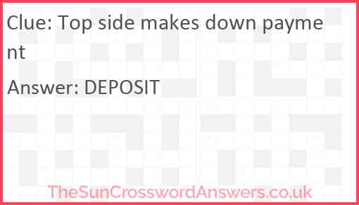 Top side makes down payment is a crossword clue for which we have 1 possible answer and we have spotted 2 times in our database. This crossword clue was last seen on 09 January 2025 in The Sun Cryptic Crossword puzzle!