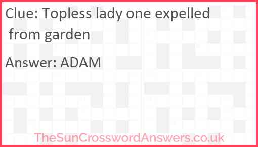 Topless lady one expelled from garden is a crossword clue for which we have 1 possible answer and we have spotted 2 times in our database. This crossword clue was last seen on 09 August 2021 in The Sun Cryptic Crossword puzzle!