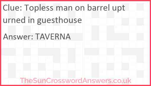 Topless man on barrel upturned in guesthouse is a crossword clue for which we have 1 possible answer and we have spotted 2 times in our database. This crossword clue was last seen on 01 August 2023 in The Sun Cryptic Crossword puzzle!