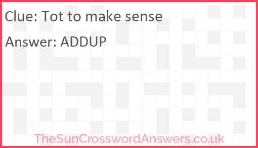 Tot to make sense is a crossword clue for which we have 1 possible answer and we have spotted 2 times in our database. This crossword clue was last seen on 13 December 2023 in The Sun Cryptic Crossword puzzle!