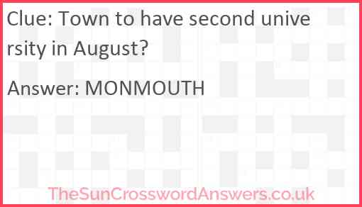Town to have second university in August? is a crossword clue for which we have 1 possible answer and we have spotted 1 times in our database. This crossword clue was last seen on 09 August 2024 in The Sun Cryptic Crossword puzzle!