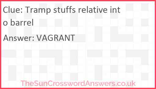 Tramp stuffs relative into barrel is a crossword clue for which we have 1 possible answer and we have spotted 2 times in our database. This crossword clue was last seen on 27 February 2023 in The Sun Cryptic Crossword puzzle!