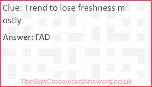 Trend to lose freshness mostly is a crossword clue for which we have 1 possible answer and we have spotted 2 times in our database. This crossword clue was last seen on 30 August 2023 in The Sun Cryptic Crossword puzzle!
