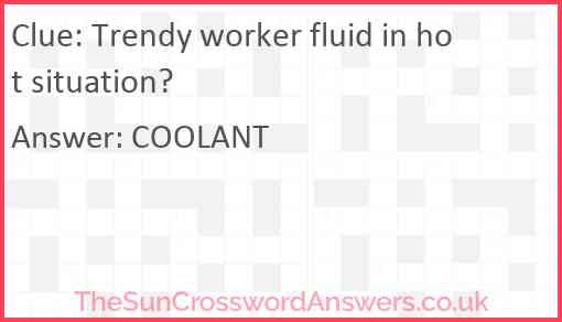 Trendy worker fluid in hot situation? is a crossword clue for which we have 1 possible answer and we have spotted 2 times in our database. This crossword clue was last seen on 11 January 2024 in The Sun Cryptic Crossword puzzle!
