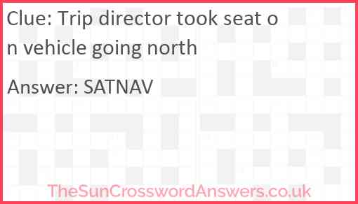 Trip director took seat on vehicle going north is a crossword clue for which we have 1 possible answer and we have spotted 2 times in our database. This crossword clue was last seen on 07 June 2023 in The Sun Cryptic Crossword puzzle!