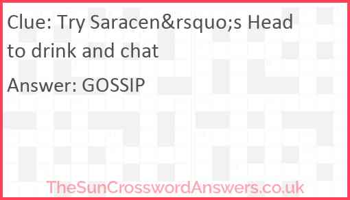 Try Saracen’s Head to drink and chat is a crossword clue for which we have 1 possible answer and we have spotted 1 times in our database. This crossword clue was last seen on 05 October 2020 in The Sun Cryptic Crossword puzzle!
