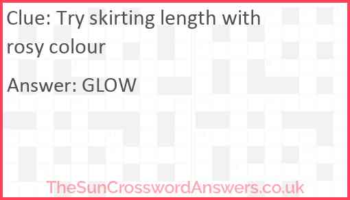 Try skirting length with rosy colour is a crossword clue for which we have 1 possible answer and we have spotted 3 times in our database. This crossword clue was last seen on 15 January 2025 in The Sun Cryptic Crossword puzzle!