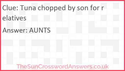 Tuna chopped by son for relatives is a crossword clue for which we have 1 possible answer and we have spotted 2 times in our database. This crossword clue was last seen on 13 March 2025 in The Sun Cryptic Crossword puzzle!