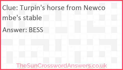 Turpin's horse from Newcombe's stable is a crossword clue for which we have 1 possible answer and we have spotted 1 times in our database. This crossword clue was last seen on 01 February 2025 in The Sun Cryptic Crossword puzzle!