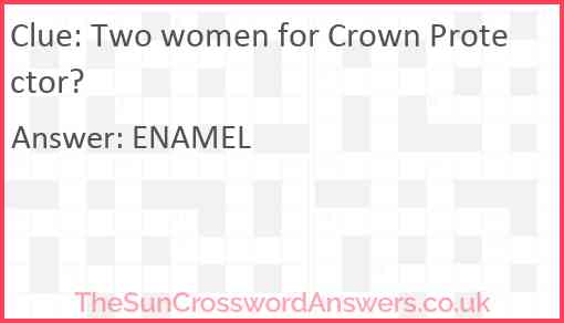 Two women for Crown Protector? is a crossword clue for which we have 1 possible answer and we have spotted 1 times in our database. This crossword clue was last seen on 05 November 2024 in The Sun Cryptic Crossword puzzle!