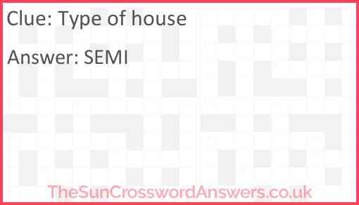 Type of house is a crossword clue for which we have 1 possible answer and we have spotted 1 times in our database. This crossword clue was last seen on 26 October 2018 in The Sun Coffee Time Crossword puzzle!
